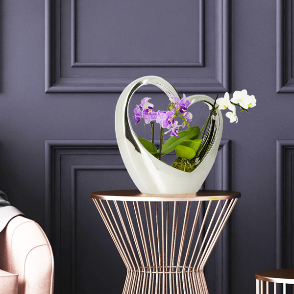 Cœur en céramique argenté de 25cm contenant deux mini-orchidées. La couleur des orchidées varie en fonction de l'arrivage et afin de vous assurer un produit de qualité, les végétaux ne voyagent pas dans leur cœur en céramique.