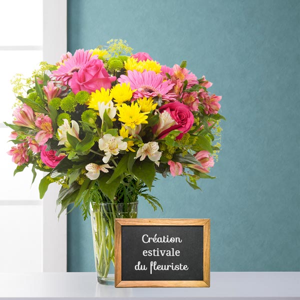 Création florale estivale (bouquet ou composition florale) réalisée avec des fleurs de saison avec la touche artistique propre à l'artisan.