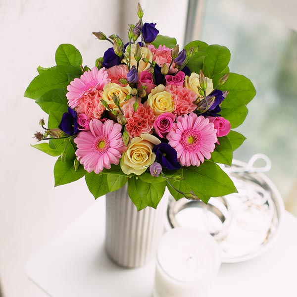 Bouquet rond dans les tons rose et violet avec une pointe de jaune composé de germinis, de roses et autres fleurs de saison.