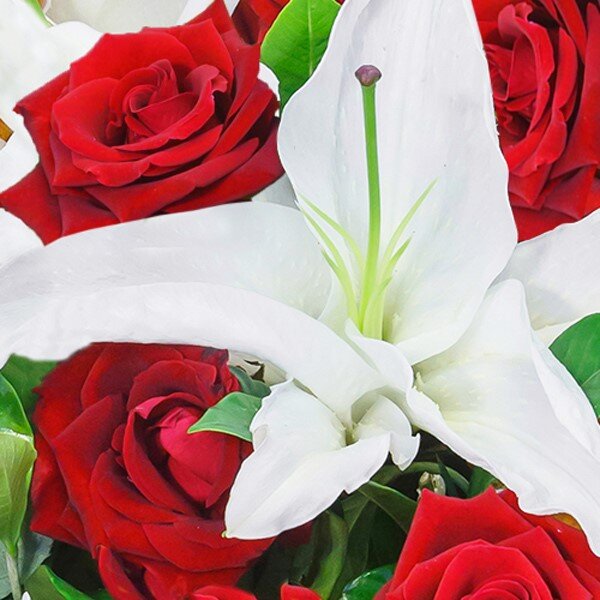 Bouquet mi-tiges avec lys blancs et roses rouges.