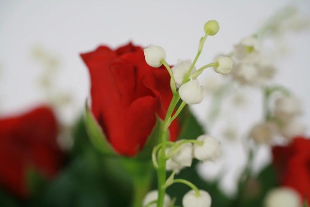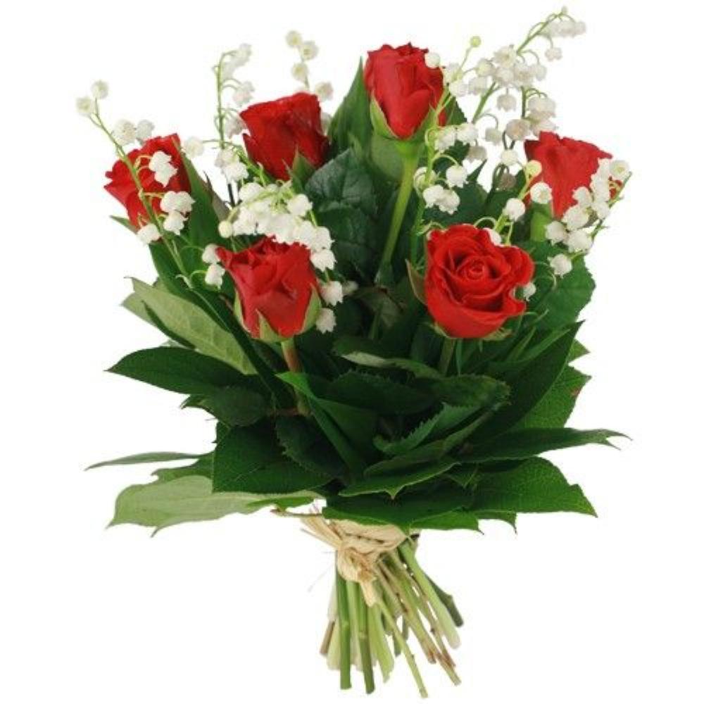 Bouquet composé de brins de muguet et de roses rouges avec feuillage.