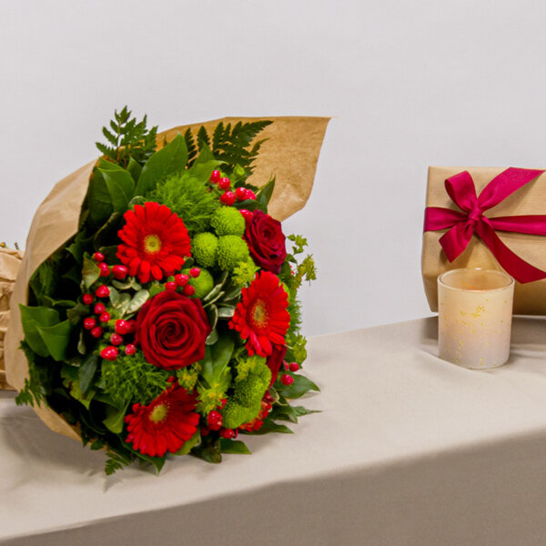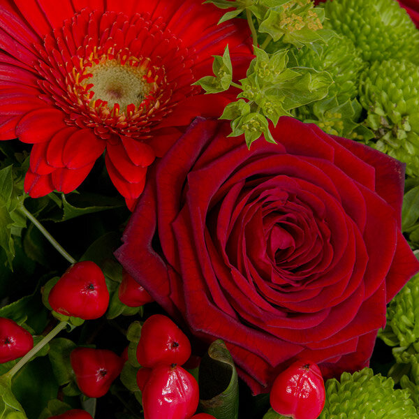Bouquet rond dans les tons rouge et vert composé de gerberas, roses et autres fleurs de saison.