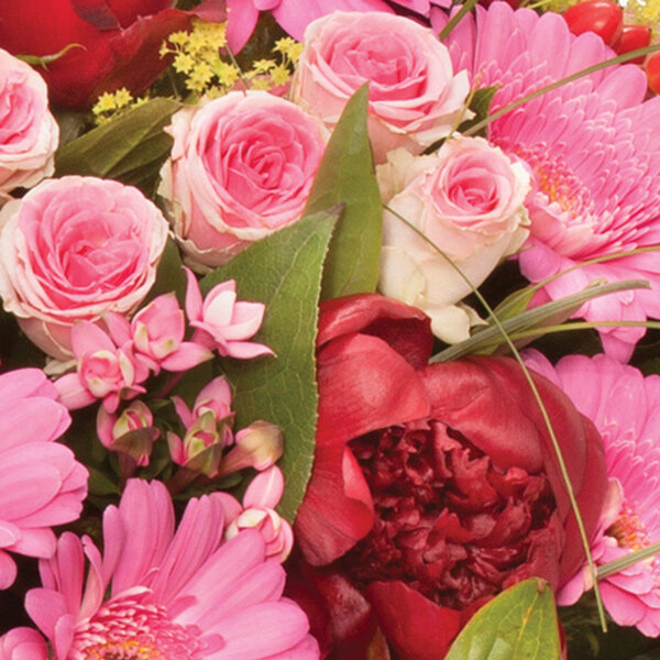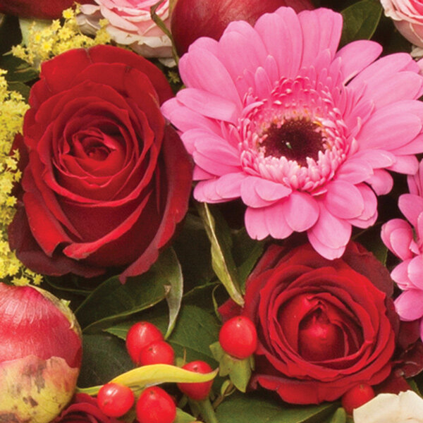 Gros bouquet dans les tons rose, rouge et vert composé de diverses roses, germinis et autres fleurs de saison (la variété et la période peuvent faire varier le prix des roses. Ainsi, pour un tarif affiché, un bouquet de roses peut être composé d'un nombre différent de tiges).