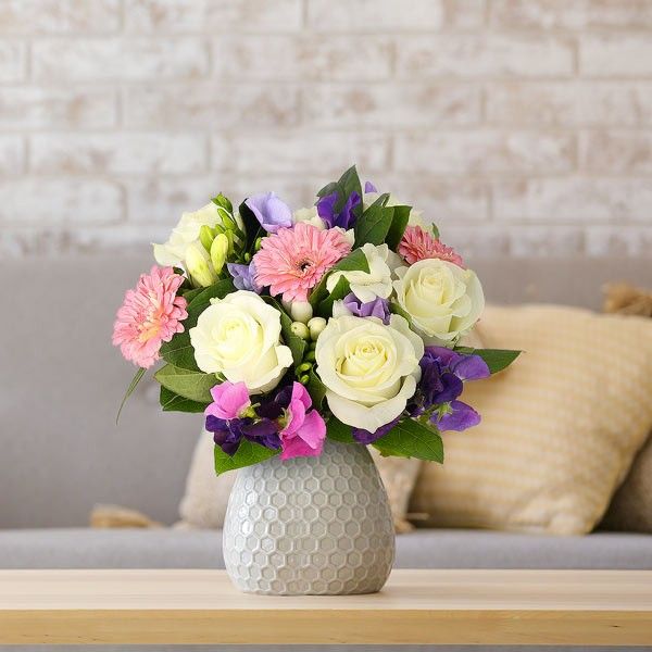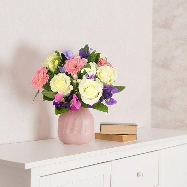 Parfaite symbiose de blanc immaculé, de rose dynamique et de violet profond, ce vibrant bouquet nous parle plénitude, douceur de vivre et profondeur des sentiments, idéal pour la fête des mères. Nous adorons les majestueuses roses blanches qui lient avec bonheur tous les ingrédients de cette jolie composition. Bouquet tendre et profond à offrir sincèrement à votre maman pour sa fête !
