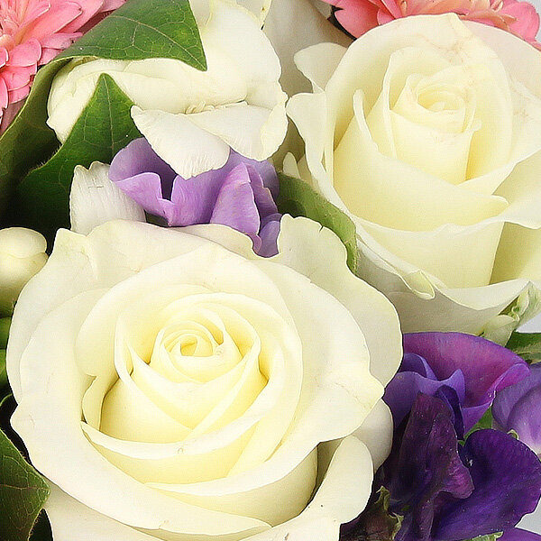 Bouquet rond dans les tons blanc, rose et mauve composé de roses blanches, pois de senteur rose et mauve, freesias blancs, gerberas rose soutenu et salal.
