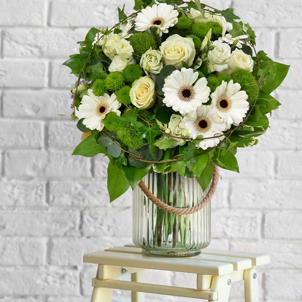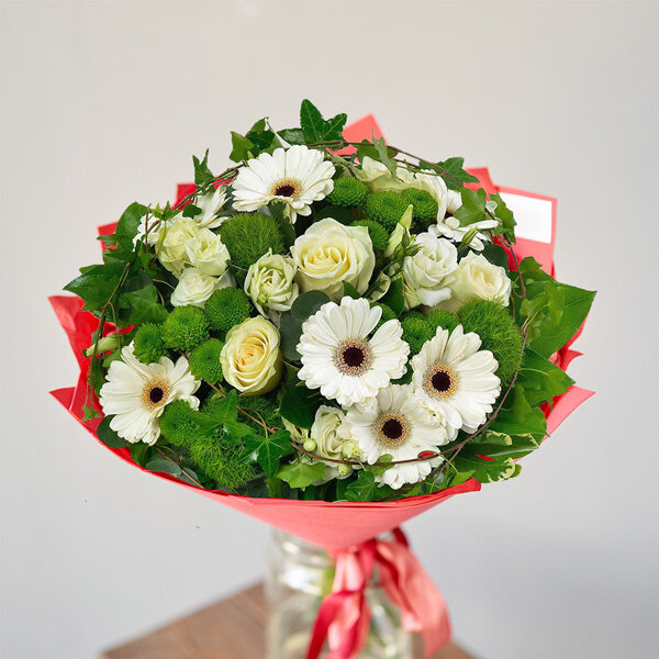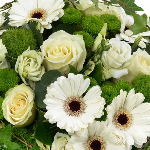 Bouquet rond dans les tons blanc et vert composé de germinis, roses et autres fleurs de saison.