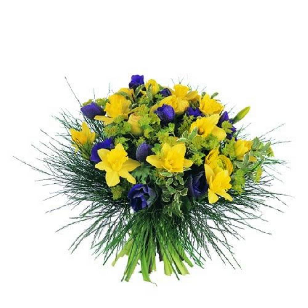 Bouquet rond composé d'anémones, de renoncules et de jonquilles. Feuillage : mirthe, pittosporum, asparagus et blupeureums (tons jaune et bleu).