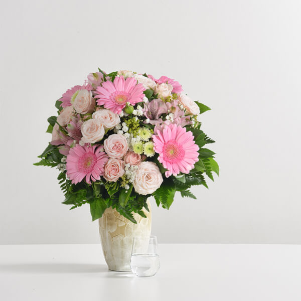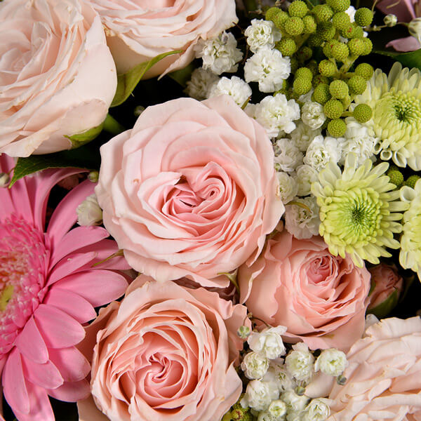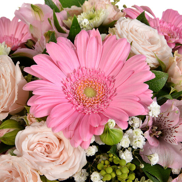 Bouquet rond composé de germinis, roses et autres fleurettes dans les tons rose et blanc.