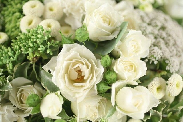 Bouquet rond composé de diverses fleurs blanches de saison.