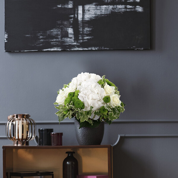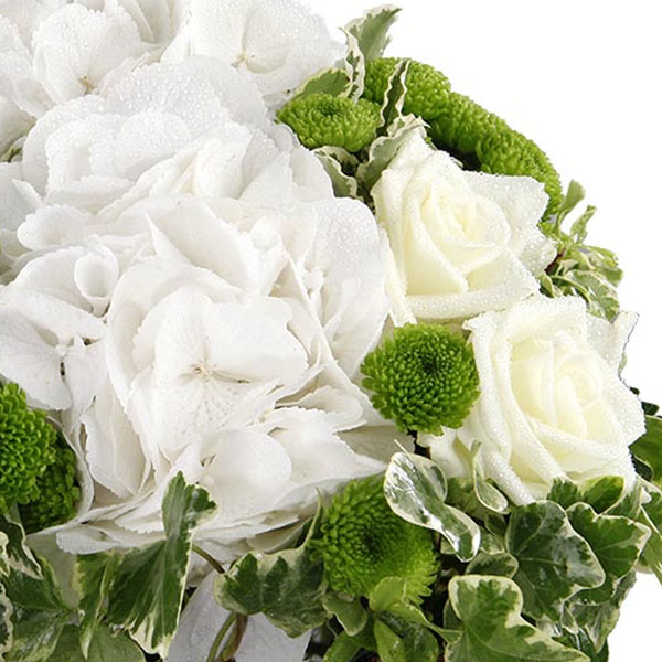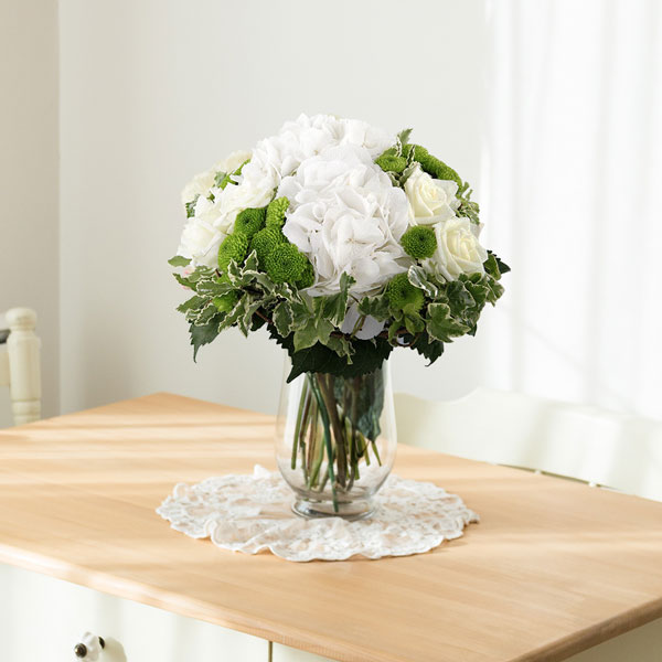 Bouquet rond avec d'imposantes têtes d'hortensias et d'élégantes roses dans les tons blanc et vert.