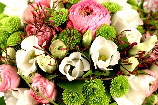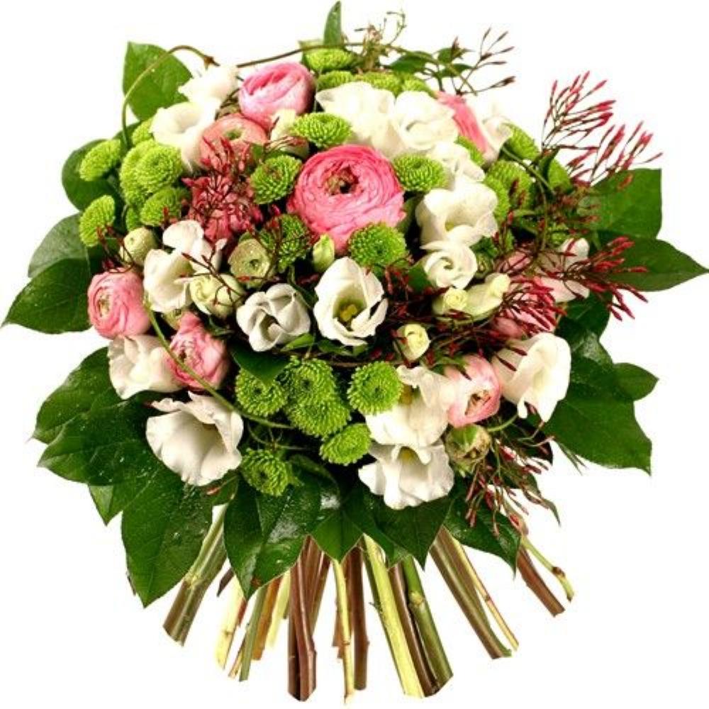 Bouquet rond composé de renoncules roses en saison (ou pivoines) , santinis, eustomias et lianes jasmin. Feuillage : sallal tips. (tons : rose, blanc et vert)