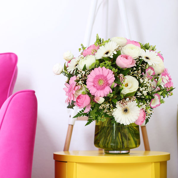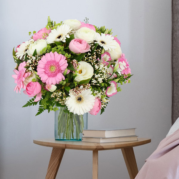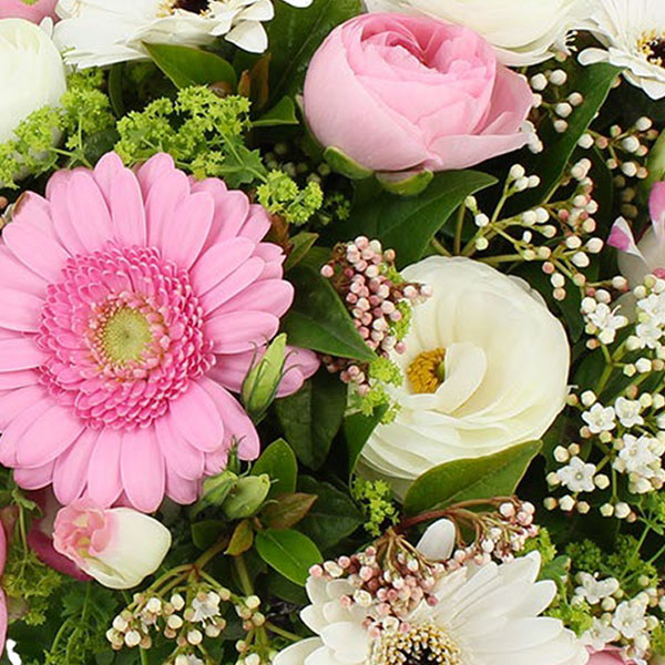 Bouquet rond dans les tons rose et blanc avec une touche de vert composé de gerberas, renoncules et autres petites fleurettes.