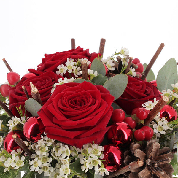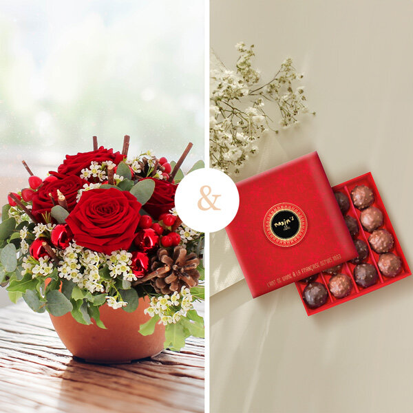 Composition piquée ronde de roses rouges, fleurettes blanches et baies rouges, avec des feuillages variés, déco de Noël, présentée dans un contenant (le contenant peut varier en fonction des disponibilités du fleuriste), accompagnée de sa boite de 12 rochers pralinés Maxim's au chocolat au lait et chocolat noir (160g).