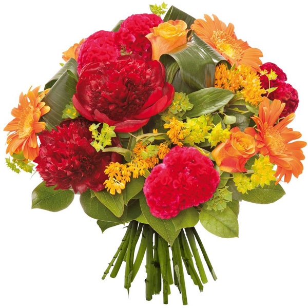 Bouquet rond dans les tons rouge soutenu, orange et vert composé de gerberas orange, celosie rouge, pivoines rouges (peut varier en fonction de la saison), asclepia orange, roses orange, bupleurum, feuilles d'aspidistra retournées et salal.