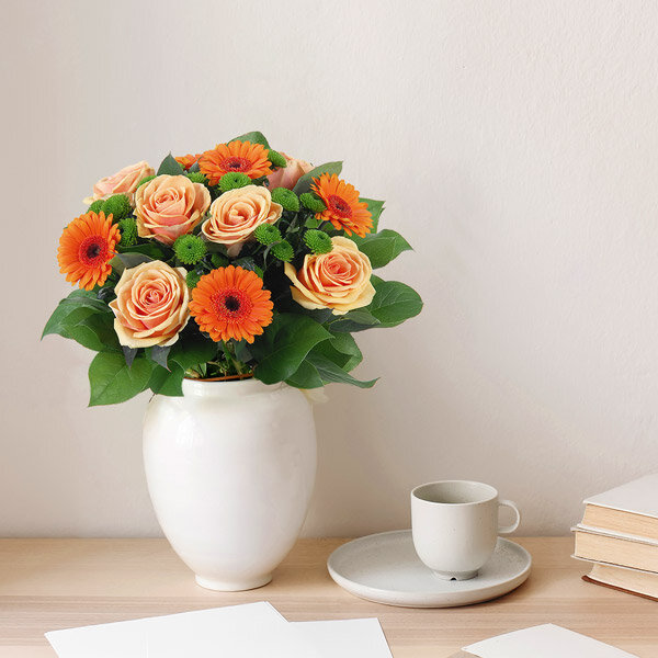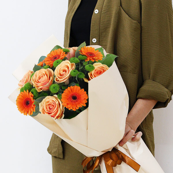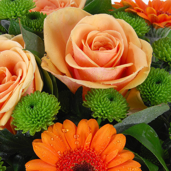Bouquet dans les tons orange composé de germinis, roses, santinis et feuillage.