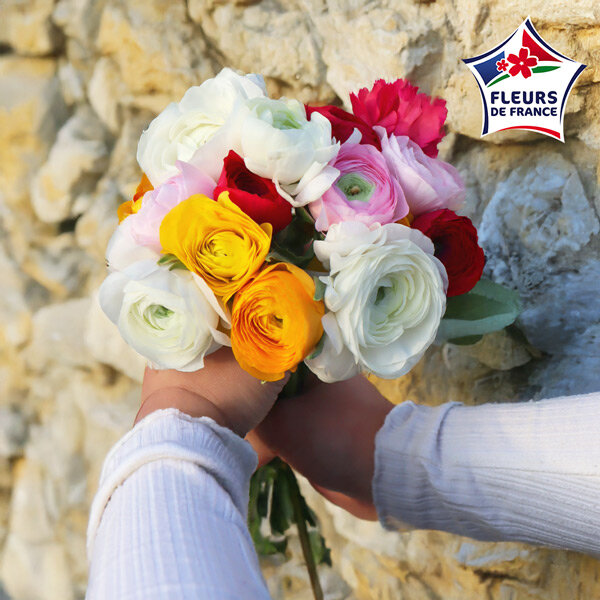 Bouquet composé de 15 renoncules françaises multicolores.