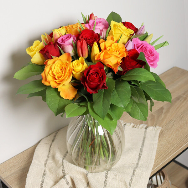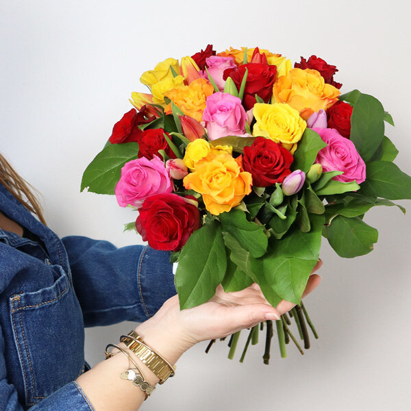 Succombez au charme de cette jolie brassée de roses et tulipes multicolores, choisies avec soin par Florajet. Exprimez toute votre reconnaissance et votre affection à l'un de vos proches avec cette élégante création florale.