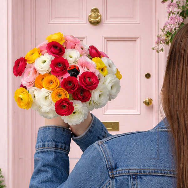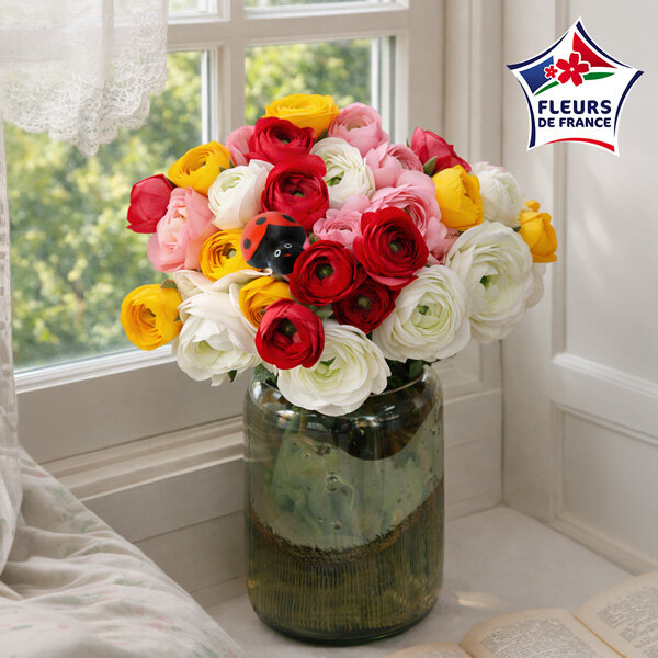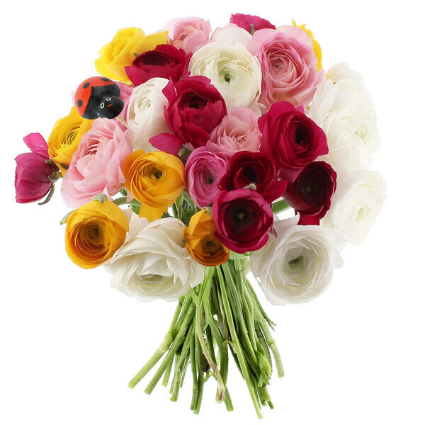 Bouquet composé de 30 renoncules françaises multicolores, accompagné de son pic coccinelle.