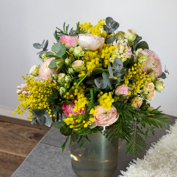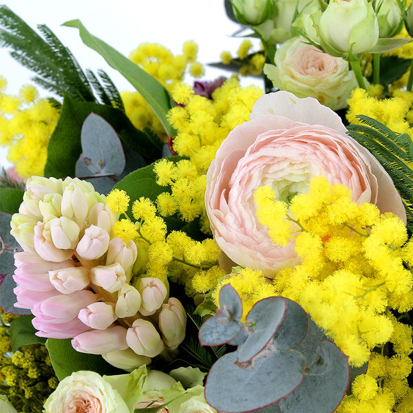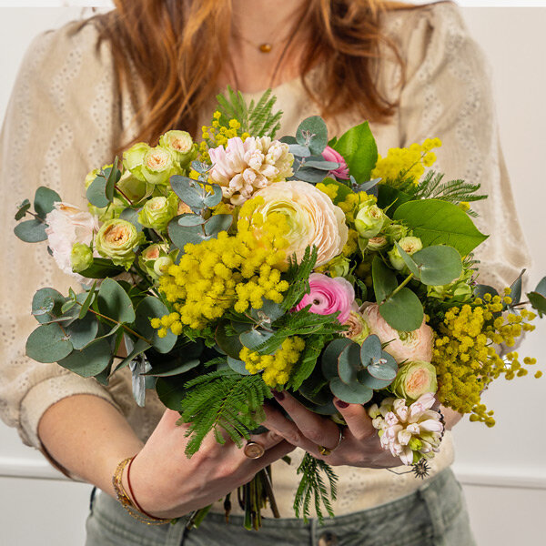 Bouquet composé de mimosa, renoncules, jacinthes et autres fleurs de saison.