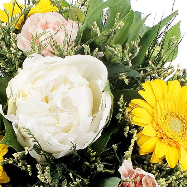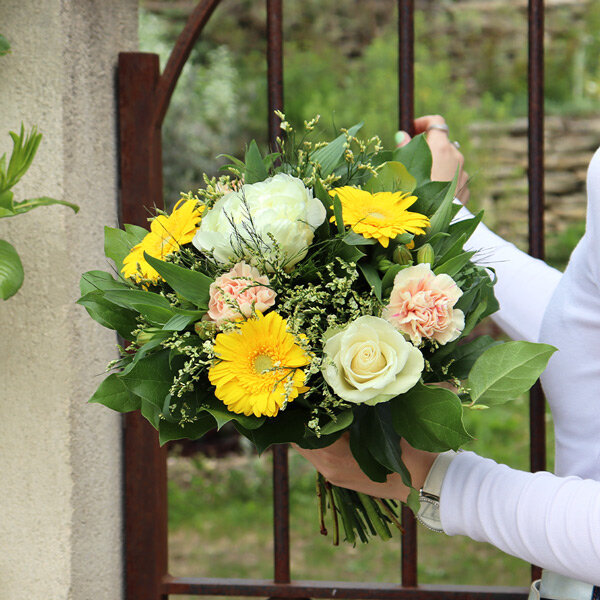 Bouquet dans le ton jaune, orange et blanc, composé de pivoines, germinis, oeillets, rose et alstro.