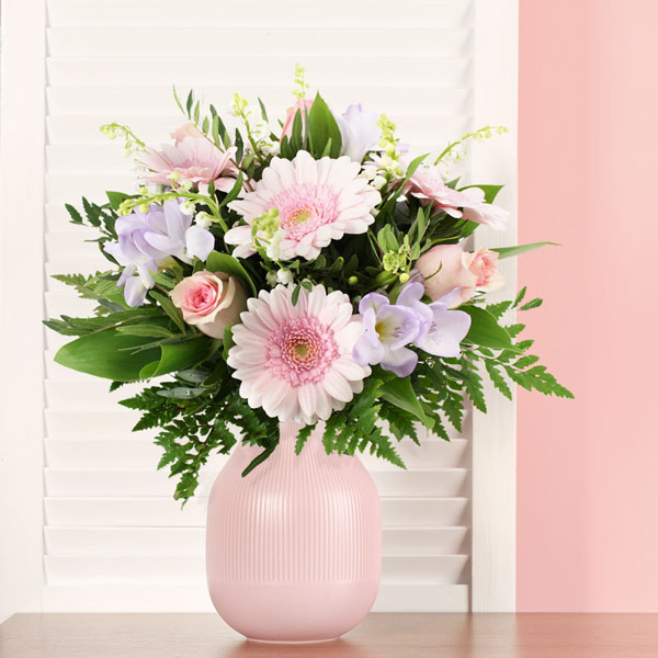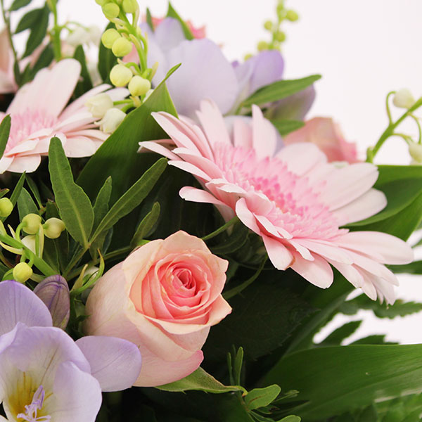 Bouquet rond dans les tons roses pastel composé de roses, brins de muguet, gerberas, fleurs de saison et feuillages.