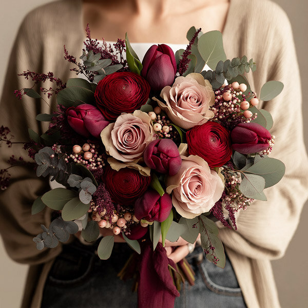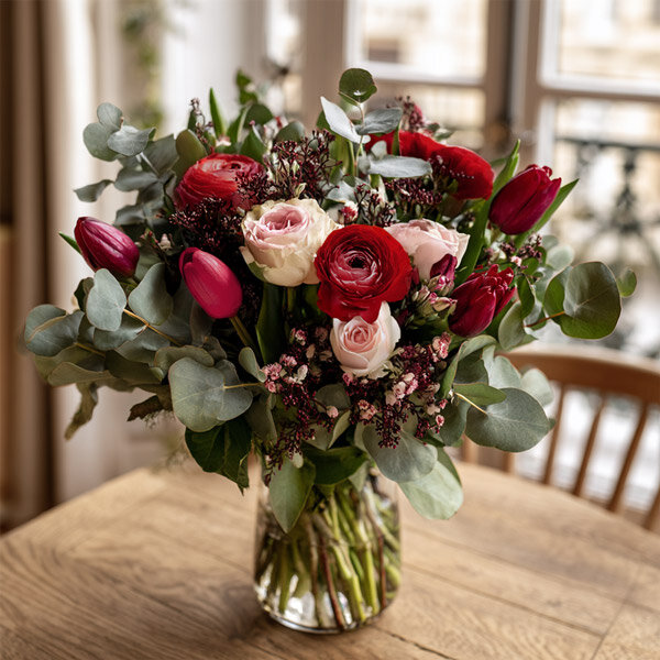 Le bouquet Avenir, c'est un peu comme une déclaration en douceur. Tulipes et renoncules se côtoient dans un joli mélange de rondeur et de légèreté, le tout porté par l'eucalyptus qui apporte cette petite touche aérienne qu'on aime.