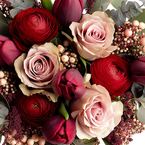 Bouquet dans les tons rouge et rose, composé de tulipes, renoncules, roses et de son feuillage.