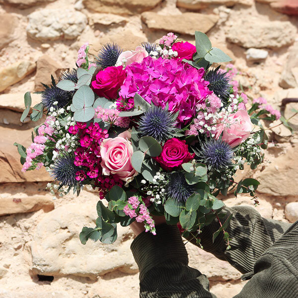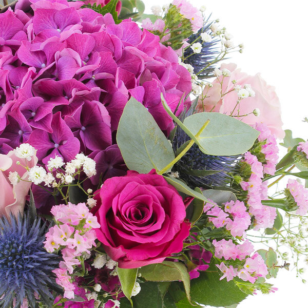 Bouquet dans les tons roses et bleu, composé d'hortensias, de roses, de chardons et de son feuillage.