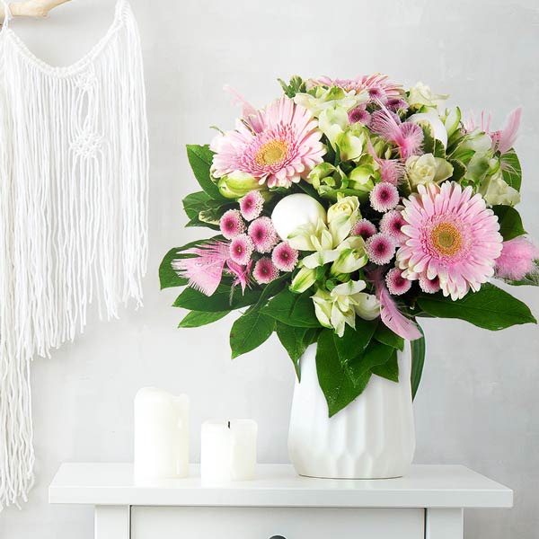 Bouquet dans les tons rose et blanc composé de roses, de gerberas et autres fleurettes de saison, le tout accompagné de feuillage divers.