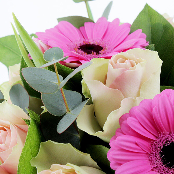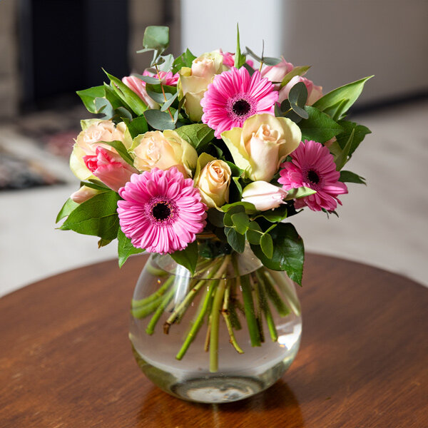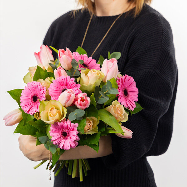 Bouquet rond dans les tons de rose composé de germinis, roses, tulipes et autres fleurs de saison, accompagné d'un feuillage discret.