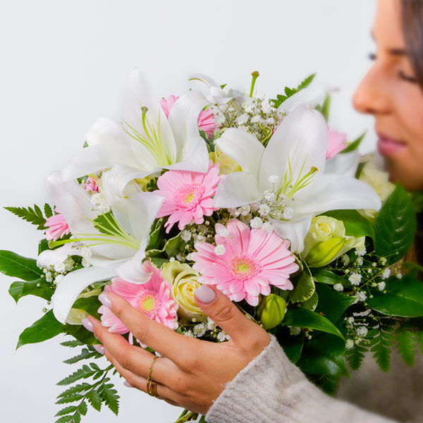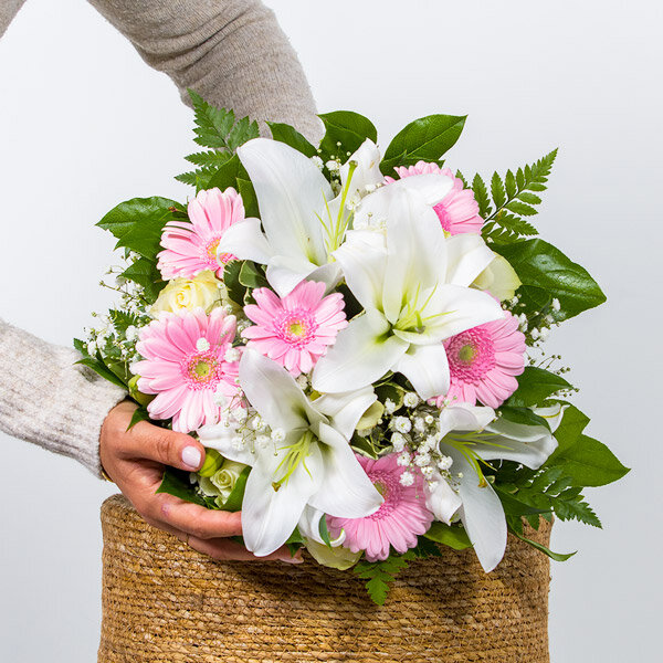 Bouquet rond dans les tons rose et blanc, composé de petites roses, germini, lys et feuillages.