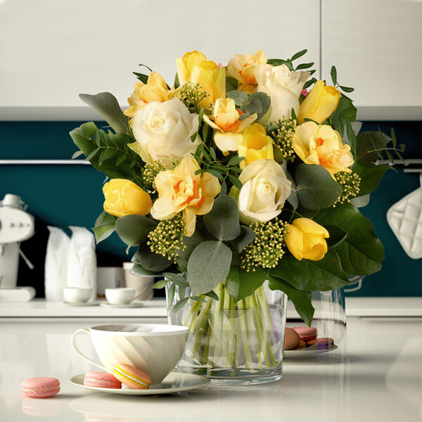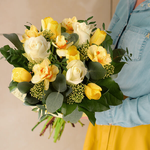 Nos artisans fleuristes ont créé cet éclatant bouquet en hommage à l'hiver finissant. Tulipes, Narcisses couleur soleil et élégantes roses feront entrer un grain de folie dans cette période de transition . Une composition dynamique à offrir gaiement !