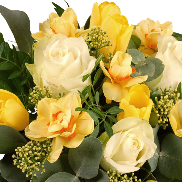 Bouquet rond dans les tons jaune/oranger, blanc et vert composé de narcisses, tulipes jaunes, roses blanches et feuillages divers tels que de l'eucalyptus, du salal... (vase non compris).