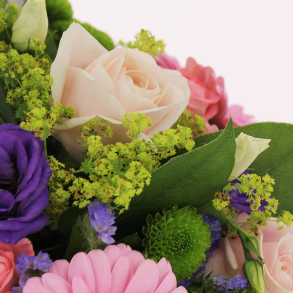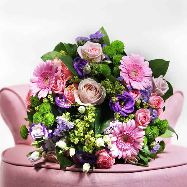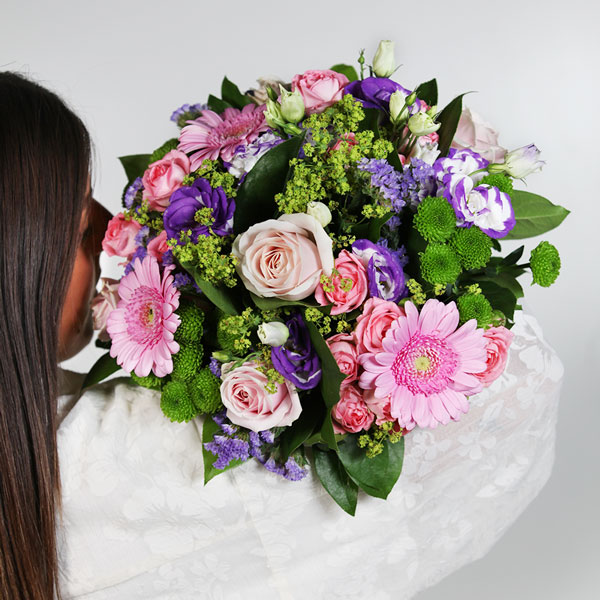 Bouquet rond dans les tons rose, fuchsia, violet et blanc composé de roses, gerberas, lisianthus fleurettes et feuillages.