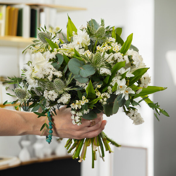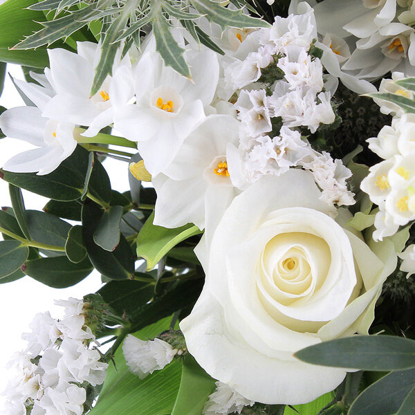 Bouquet dans les tons blancs, principalement composé de narcisses, muguets, roses, limonium et de ses agréments végétaux.