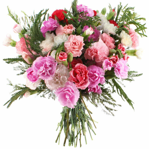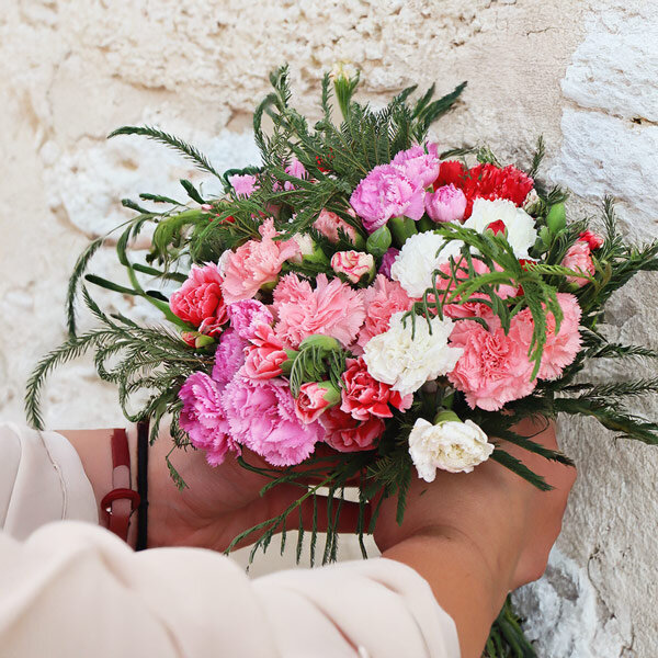 Bouquet de fleurs composé de 15 oeillets multicolores français et d'eucalyptus parvifolia.