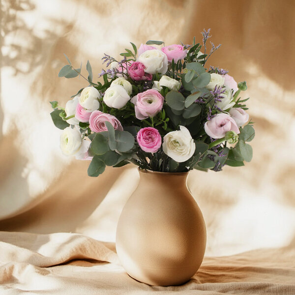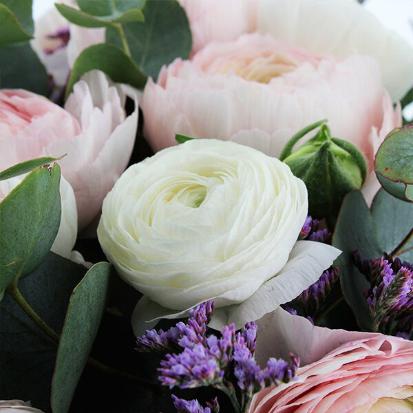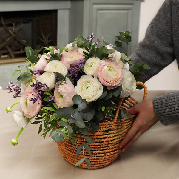 Comme un avant-gout d'été qui se projette à l'horizon. Avant tout, un petit air de printemps viendra se poser pendant quelques semaines sur nos jardins faisant fleurir les bourgeons pour nous offrir un spectacle de senteurs et de couleurs digne d'un arc en ciel après la pluie. Tout en rondeur, nos tendres renoncules s'accompagnent d'un ensemble de végétaux pour donner à ce bouquet de fleurs, un esprit printanier. Son charme incontestable ne manquera pas de captiver, lui conférant une position privilégiée au sein de nos bouquets de fleurs fête des grands-mères.