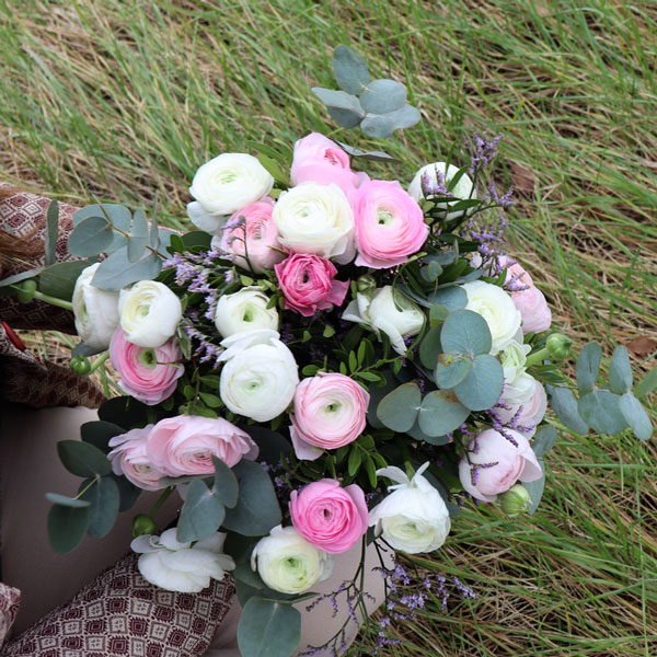 Joli bouquet composé de 25 renoncules roses pastel et blanches, 3 tiges de limonium, 3 tiges de pistacia et 4 tiges d'eucalyptus. Les fleurs qui composent ce bouquet sont de production Française et possèdent le label Fleurs de France.