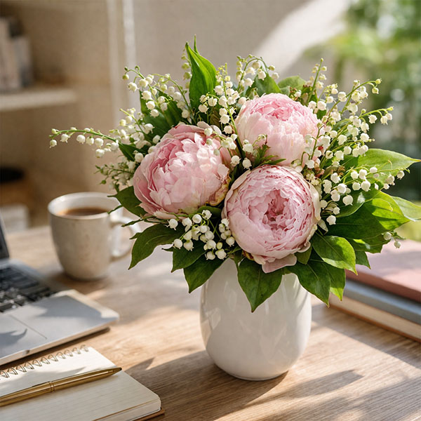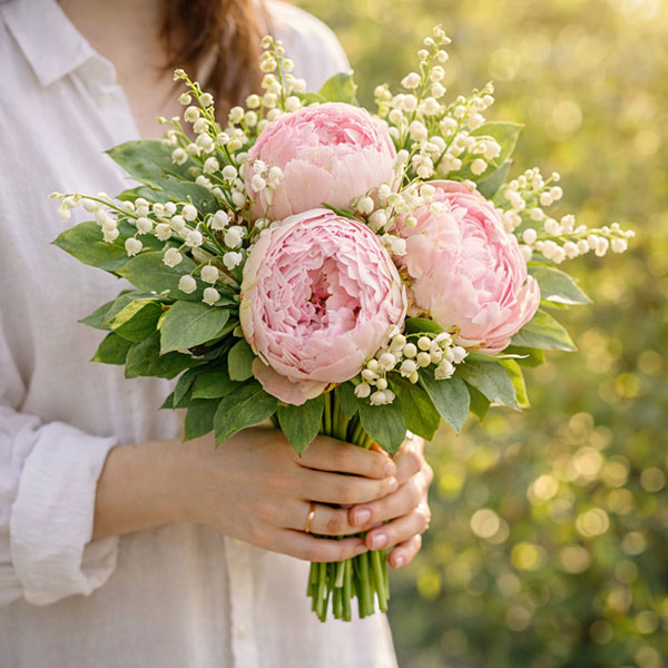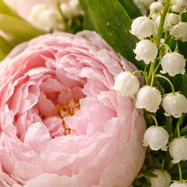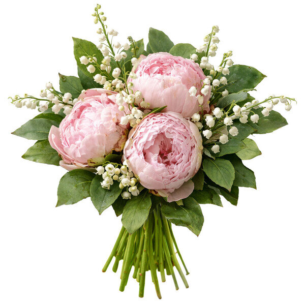 Bouquet de pivoines et brin de muguet. Coloris selon disponibilités du fleuriste en charge de votre commande.