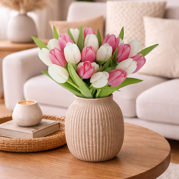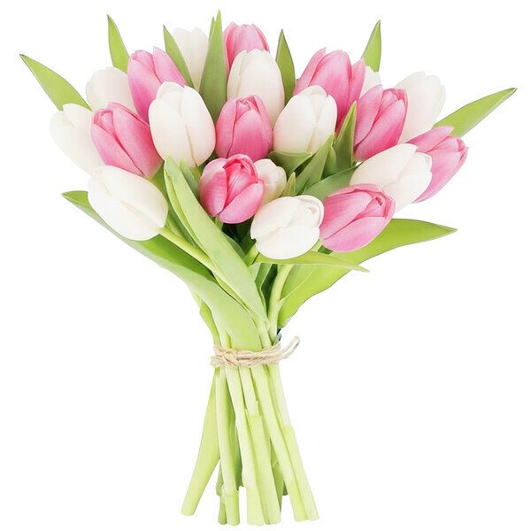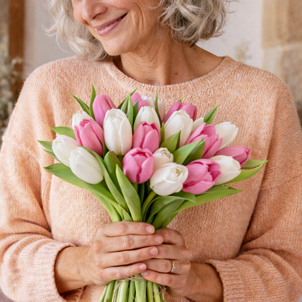 Ce bouquet de tulipes roses et blanches d’une fraîcheur délicate et d’une douceur que l'on ressent au premier regard.