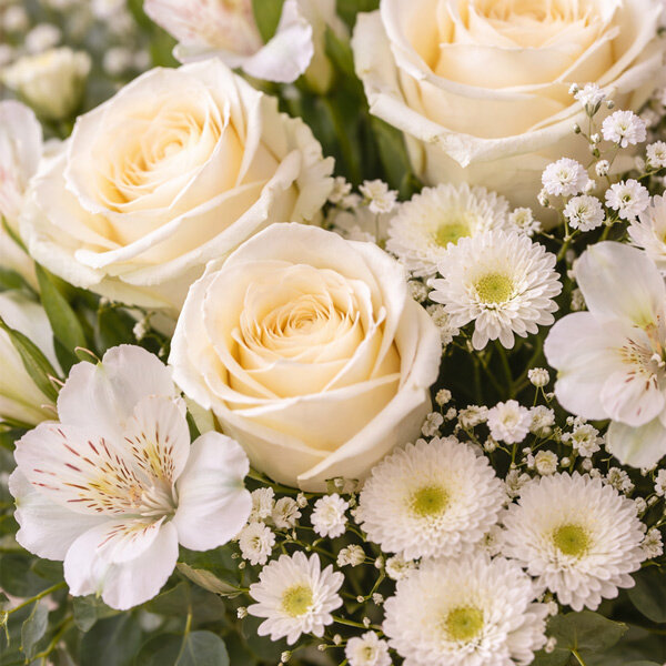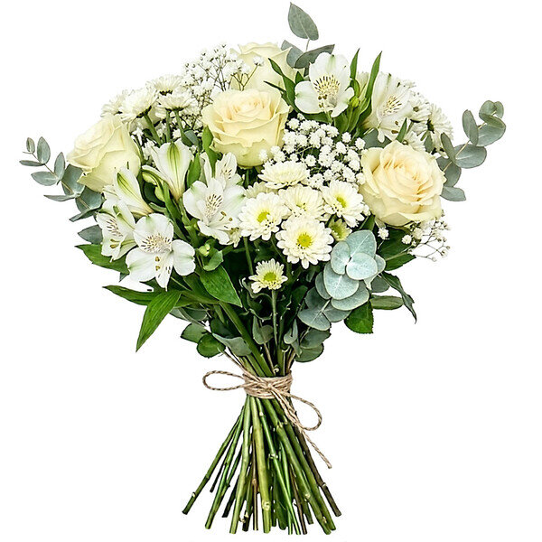 Bouquet dans les tons blancs composé de fleurs variées (roses, alstroemerias et fleurettes de saison) accompagné de feuillage.