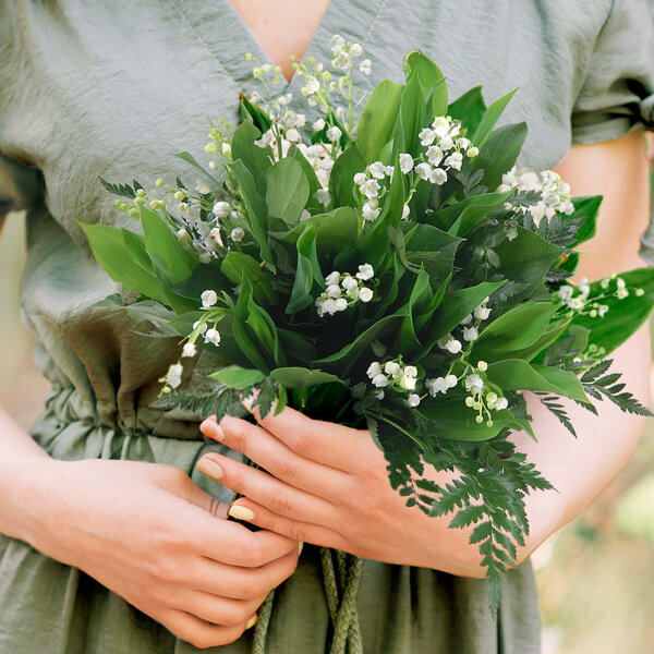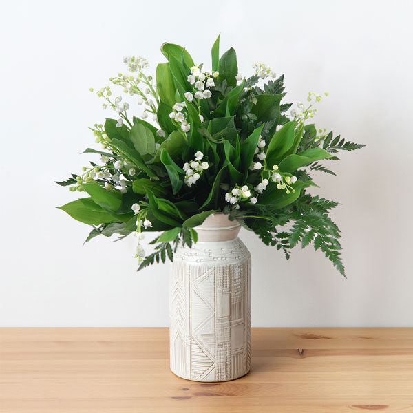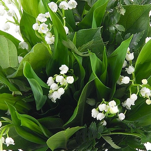 Bouquet dans les tons blancs composé de branches de muguet et de feuillage.