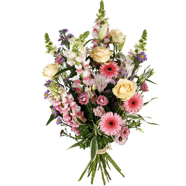 Bouquet longues tiges dans les tons rose pâle, crème et violet composé de roses, germinis, lys, lisianthus, muflier (selon disponibilité chez le fleuriste) et feuillages.