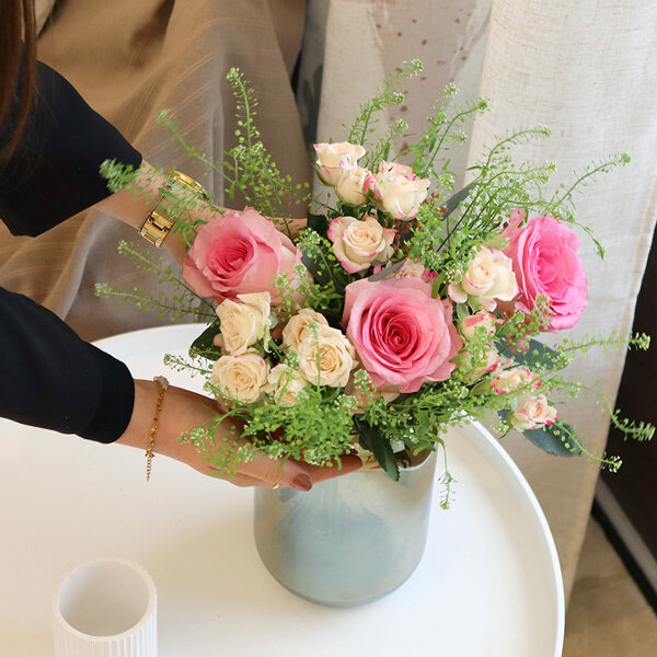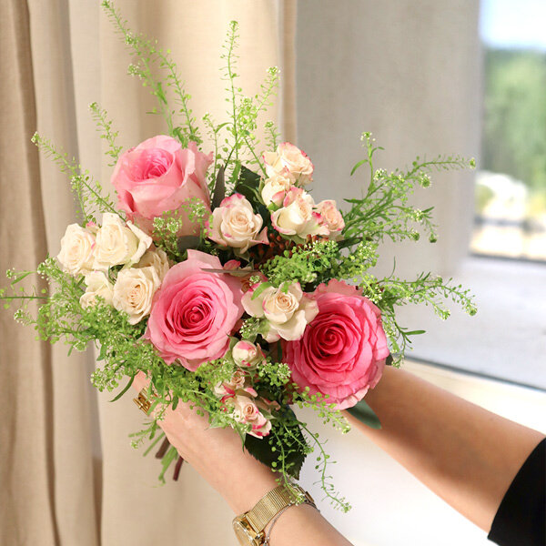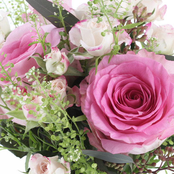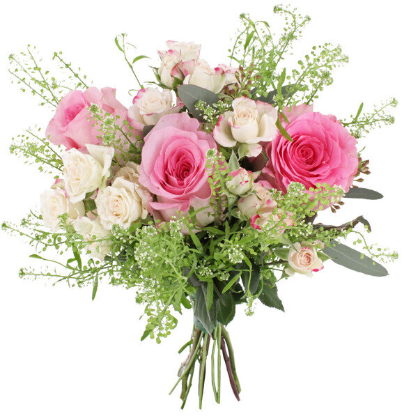 Bouquet de roses dans les tons roses et blancs, agrémenté de feuillages.