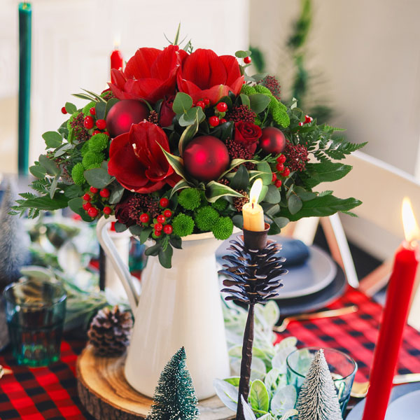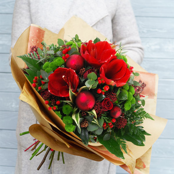 Bouquet rond de Noël dans les tons rouge et vert composé d'amarillys, santini et accompagné de boules de Noël et son feuillage.