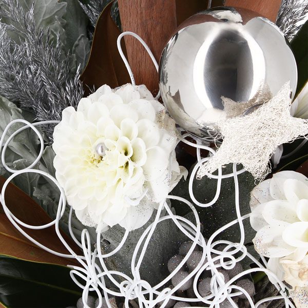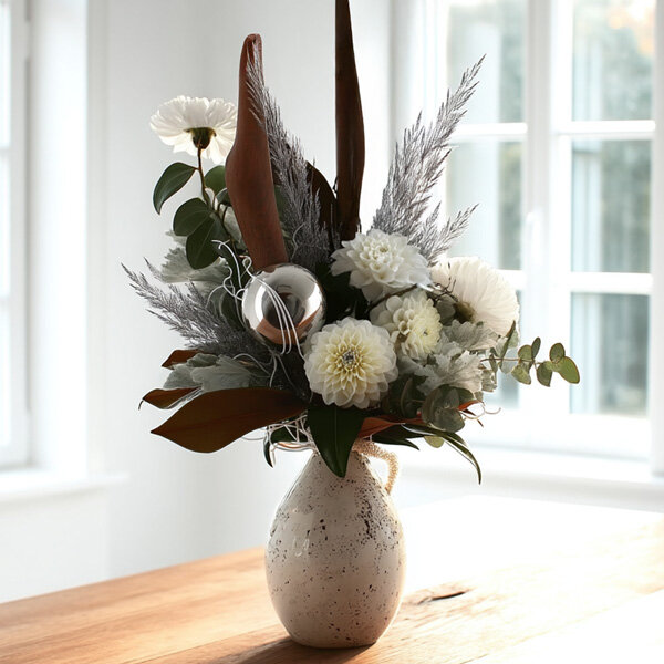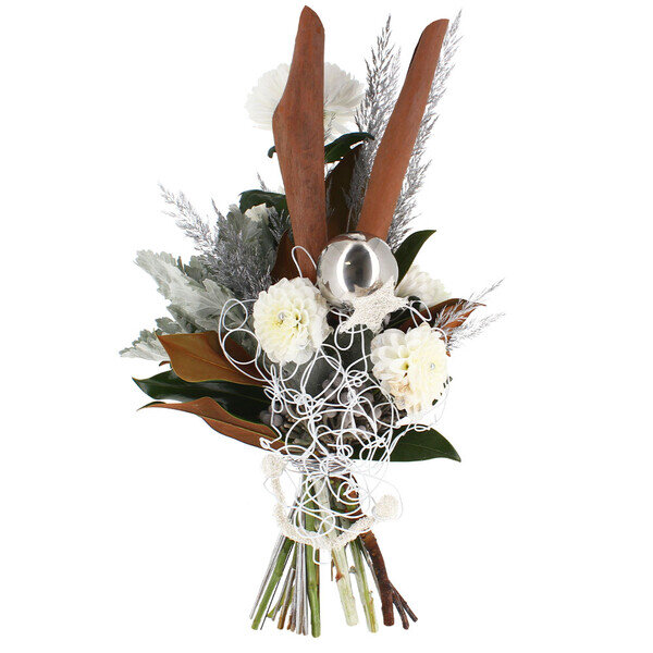 Bouquet astrologique du Capricorne, dans les tons blanc et argent, composé de dahlias ou chrysanthèmes gros pompons selon la saison et les disponibilités chez le fleuriste en charge de la commande, pampas et feuillage.