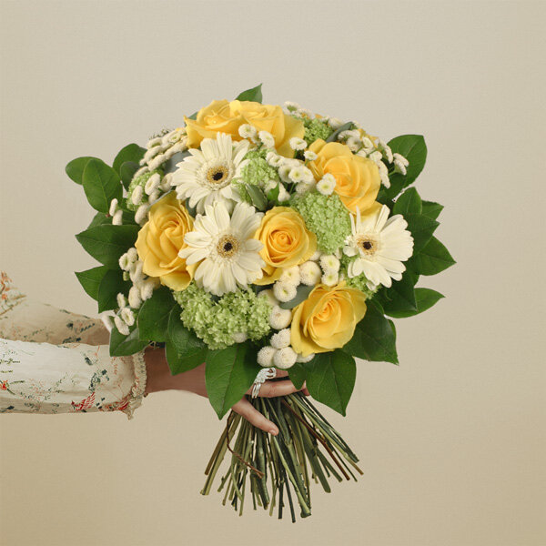 Bouquet rond dans les tons jaune, vert et blanc composé de roses, gerberas, camomilles et feuillages.