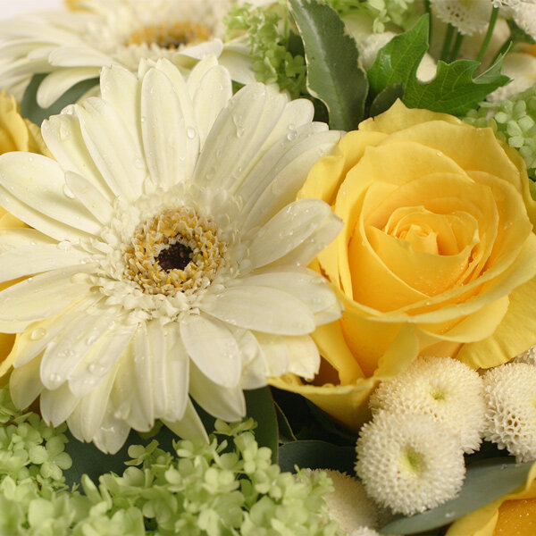 Vous apprécierez sans aucun doute cet ingénieux mélange de roses jaunes et de germinis blancs dans un écrin de feuillage d'un vert éclatant ! Ce charmant bouquet évoque les couleurs chaudes des paysages de Provence peints par Cézanne.