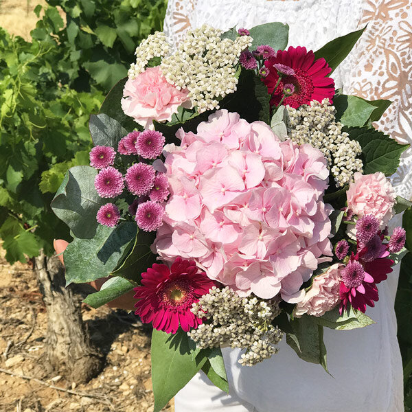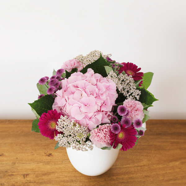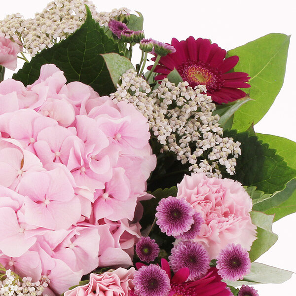 Bouquet dans les tons roses composé d'hortensia, de germinis et autres fleurs de saison.