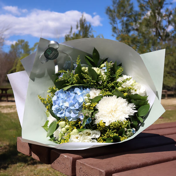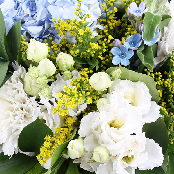Bouquet dans les tons jaunes, blancs et bleus composé d'hortensias, de lisianthus, de chrysanthème, le tout accompagné de feuillage.